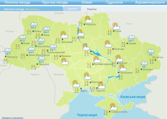 Температура повітря в Україні протягом дня 28-го лютого коливатиметься в межах +3+8 градусів, у західних областях буде холодніше, максимально лише 0+4 градуси.