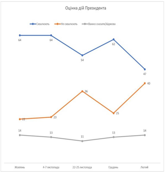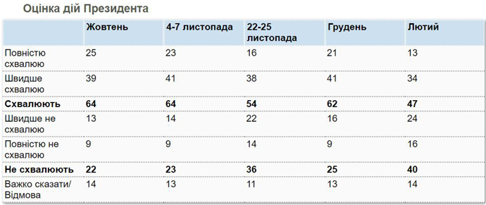 Дослівно: "Оцінка дій президента України порівняно з груднем в лютому погіршилася: на 15 відсоткових пунктів стало менше тих, хто схвалює його роботу (з 62% до 47%), і на 15 відсоткових пунктів зросла частка тих, хто не схвалює (з 25% до 40%)".