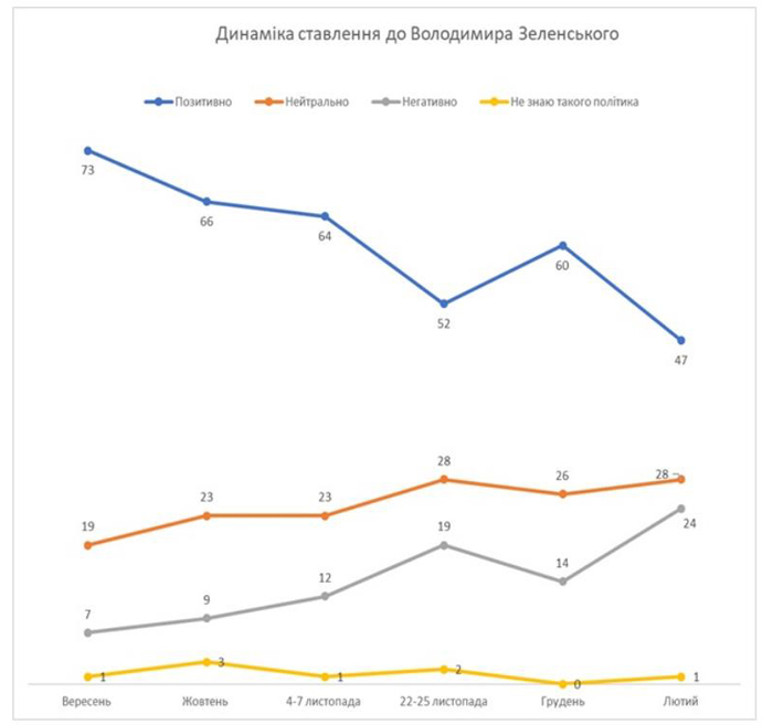 Деталі: Крім того, за результатами опитування, у лютому до Зеленського позитивно ставляться 47% опитаних, негативно – 24%.