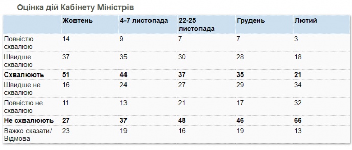 Також погіршилася оцінка дій Кабміну порівняно з груднем: на 14 відсоткових пунктів стало менше тих, хто схвалює його роботу (з 35% до 21%), і на 20 відсоткових пунктів зросла частка тих, хто не схвалює (з 46% до 66%).