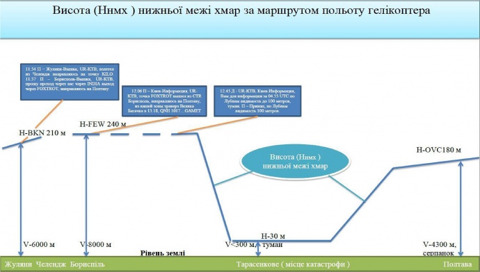 Деталі: Відповідно до звіту, востаннє пілот гелікоптера Тарас Кутовий спілкувався із диспетчером о 12:45. Диспетчер проінформував пілота, що у Лубнах об 04:55 була видимість до 100 метрів, туман. Пілот підтвердив отримання інформації ("Принял, по Лубнам видимость сто метров").