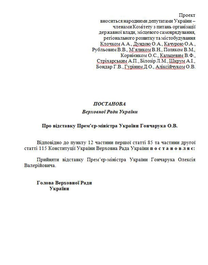 Дослівно: "Відповідно до пункту 12 частини першої статті 85 та частини другої статті 115 Конституції України Верховна Рада України постановляє: прийняти відставку прем'єр-міністра України Гончарука Олексія Валерійовича".
