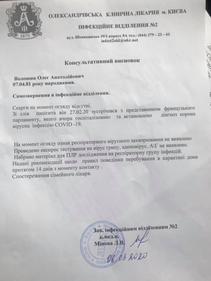 6 березня нардеп від "ЄС" Вікторія Сюмар заявила, що Волошина, який контактував з інфікованим на коронавірус депутатом Національної асамблеї Франції, ізолювали.