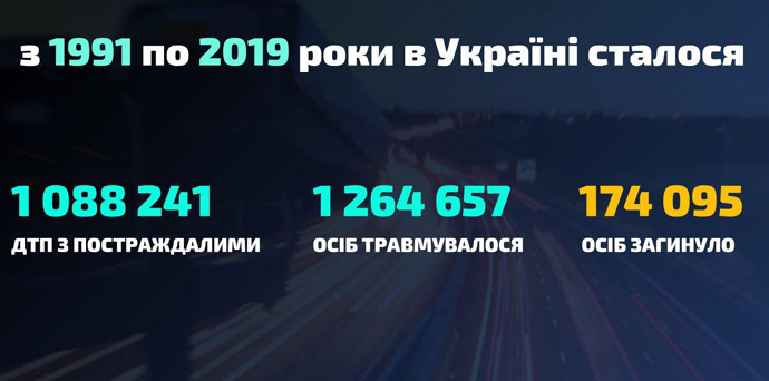 За статистикою, яку презентували в МВС, з 1991 по 2019 рр. в Україні внаслідок ДТП загинуло 174 095 осіб.