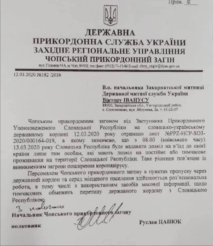Дослівно: "ОФІЦІЙНО! Відсьогодні, 13 березня, з 8:00 ранку Словаччина обмежила пропуск на свою територію. Дозвіл на в’їзд надаватиметься лише громадянам Словаччини та особам, які мають документи на постійне або тимчасове проживання на території Словацької Республіки".