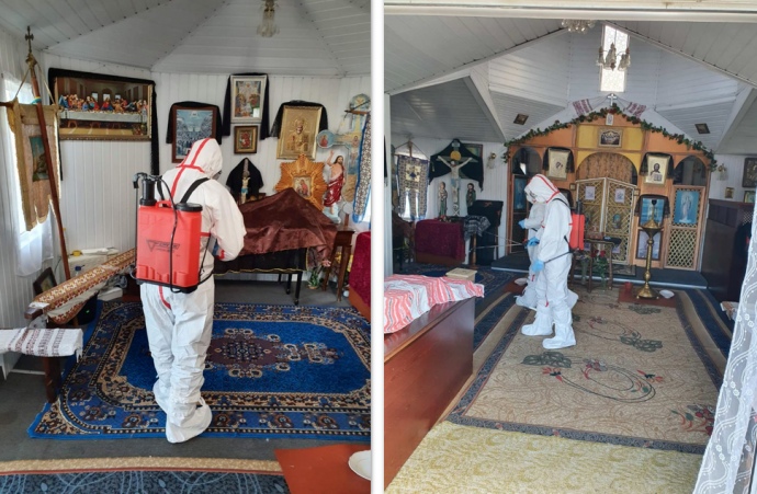 13 березня працівники Державної служби з надзвичайних ситуацій у Житомирській області провели дезінфекцію автовокзалу та церкви у Радомишлі, де було виявлено випадок зараження на коронавірус COVID-19.