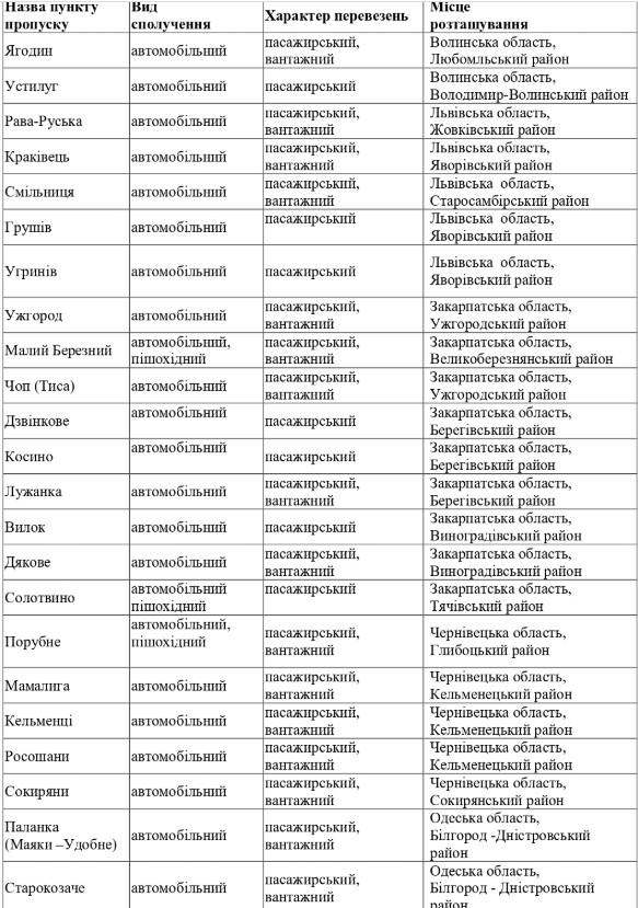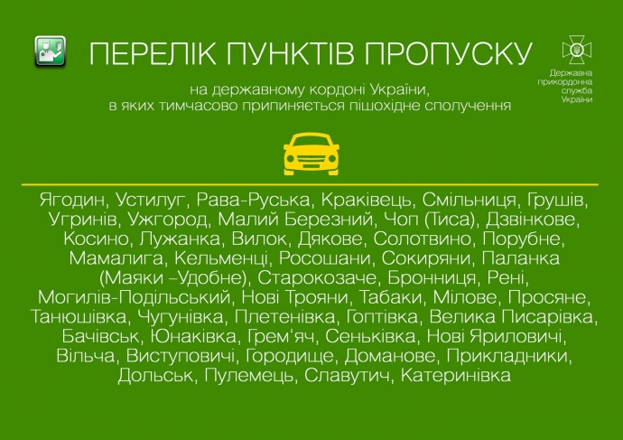 49 пунктів пропуску, в яких тимчасово припиняється пішохідне сполучення: