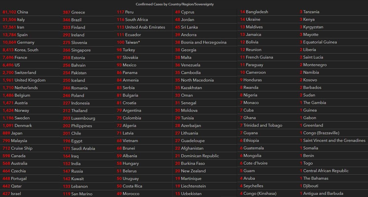 Більше за все випадків зараження зафіксовано у: Китаї (81 102), Італії (31 506), Ірані (17 361), Іспанії (13 784) та Німеччині (10 060).
