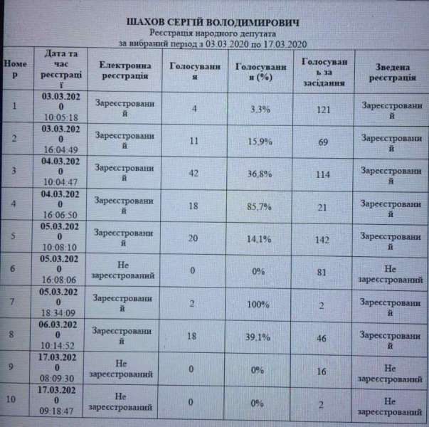 - В коментарі УП Шахов повідомив, що востаннє був у Верховній Раді 6 березня. Водночас громадський рух "ЧЕСНО" пише, що нардеп 12 березня відвідував засідання екологічного комітету.