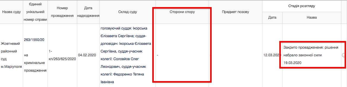 У розкладі судових засідань зазначено, що 12 березня суд закрив провадження, а 19 березня рішення набрало чинності. Це означає, що сторони не подали скарги.