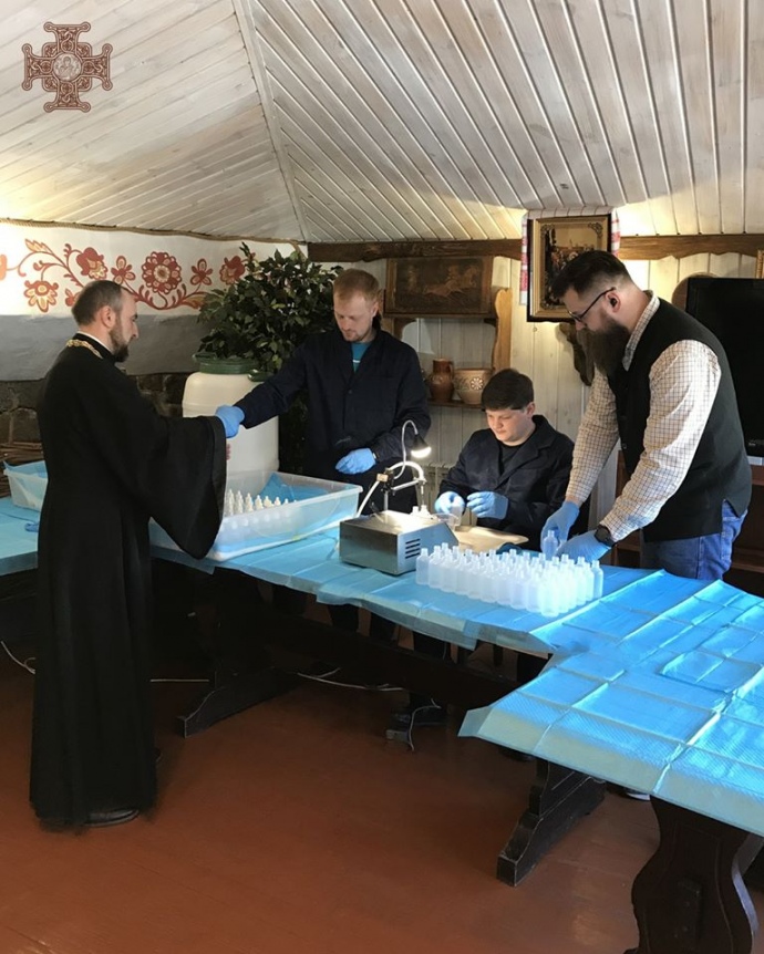 Священнослужителі Православної церкви України почали виготовляти антисептики для рук за рецептом ВООЗ та роздавати їх людям літнього віку.