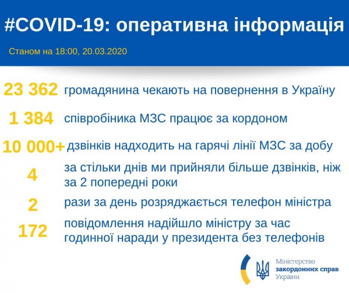 Деталі: Міністр повідомив, що наразі ще понад 23 тисячі громадян України чекають на повернення з-за кордону. За кордоном працює майже 1400 співробітників відомства.