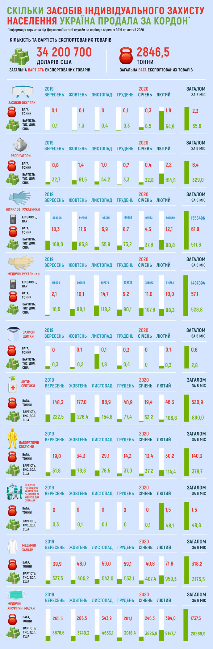 Пряма мова голови експертної організації Гліба Канєвського: "Загалом за вересень 2019 року – лютий 2020 року з України експортували медичних товарів для протидії коронавірусу на 34,2 млн доларів США.