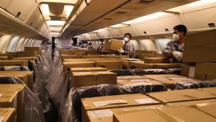 Дослівно: "Зараз у міжнародному аеропорту м.Сямень (пров. Фуцзянь) літак авіакомпанії "SCAT" Boeing 767-300 завантажується черговою партією медичних масок, захисних костюмів та інших протиепідемічних засобів для України.