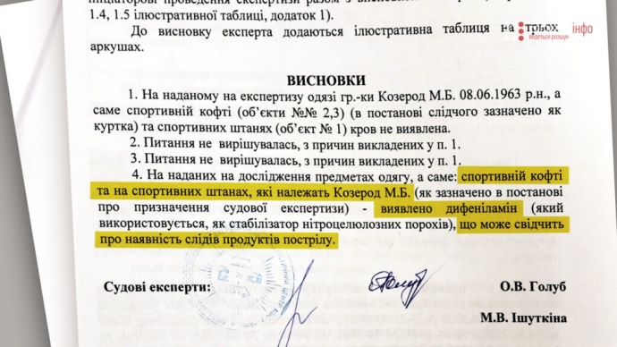 Дослівно висновок експертів: "На спортивній кофті та спортивних штанях, які належать Козерод, виявлено дифеніламін, що може свідчити про наявність слідів продуктів пострілу".