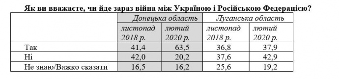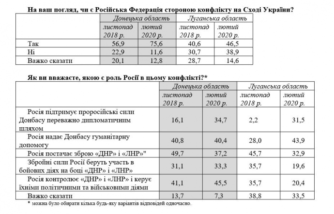 Якщо серед донецьких респондентів 3/4 вважають РФ стороною цього конфлікту (а 12% не вважають так), то серед луганських респондентів лише 47% поділяють відповідну думку, а 39% – не поділяють".