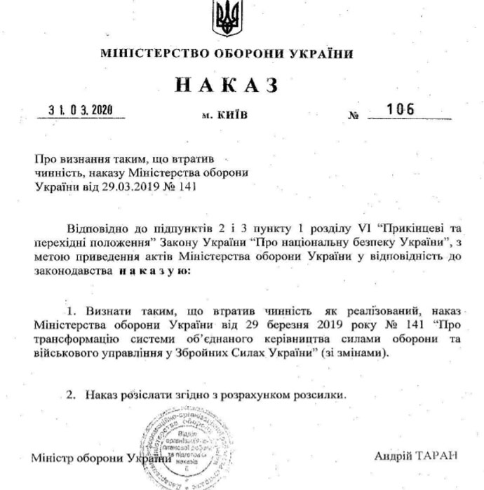 Деталі: Таран підписав наказ №106, яким наказ Полторака №141 визнав "реалізованим", і, відповідно таким, що втратив чинність, 31 березня.
