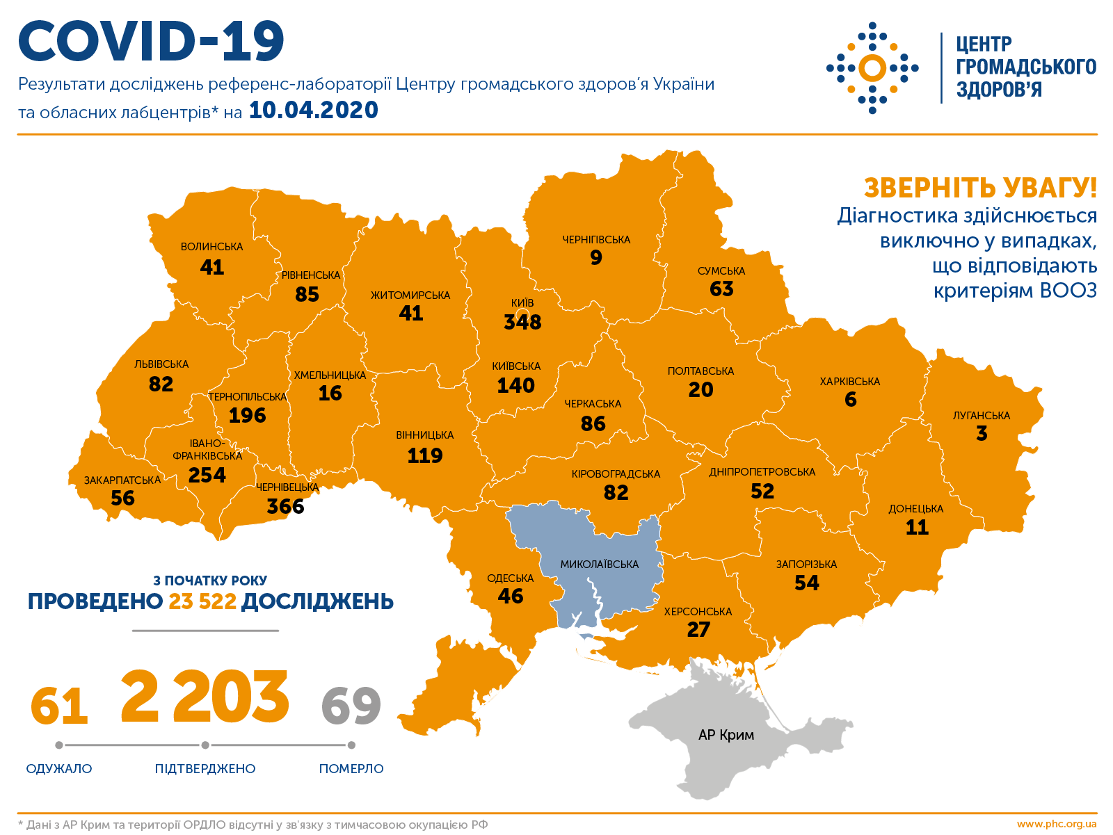 Деталі: Станом на 9 ранку 10 квітня в Україні – 2203 лабораторно підтверджені випадки COVID-19, з них 69 летальних, 61 пацієнт одужав.