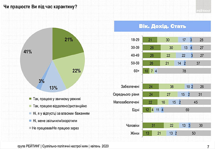 59% опитаних зазначили, що мали роботу до запровадження карантину. З них 21% зазначили, що продовжують працювати в звичному режимі після запровадження обмежень, 22% – працюють дистанційно, 13% – знаходяться у відпустці за власним бажанням і лише 3% – втратили роботу.