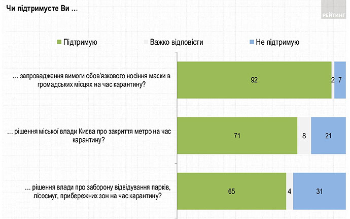 Дослівно: "92% підтримують запровадження вимоги обов’язкового носіння маски в громадських місцях. 71% – підтримують рішення міської влади Києва про закриття метро на час карантину (21% – проти)".