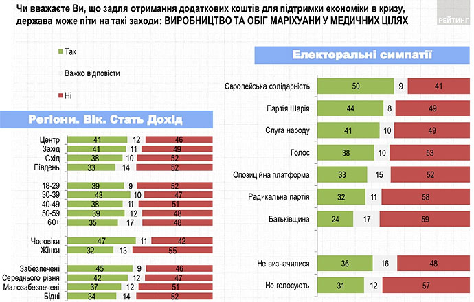 Також 49% опитаних виступають проти легалізації використання марихуани в медичних цілях. Підтримують таку ідею 39%, 12% не змогли відповісти на питання.