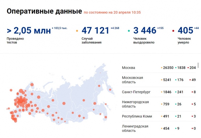 За час пандемії в РФ від коронавірусу померло 405 осіб (44 за минулу добу), одужало – 3446 (155 за добу).