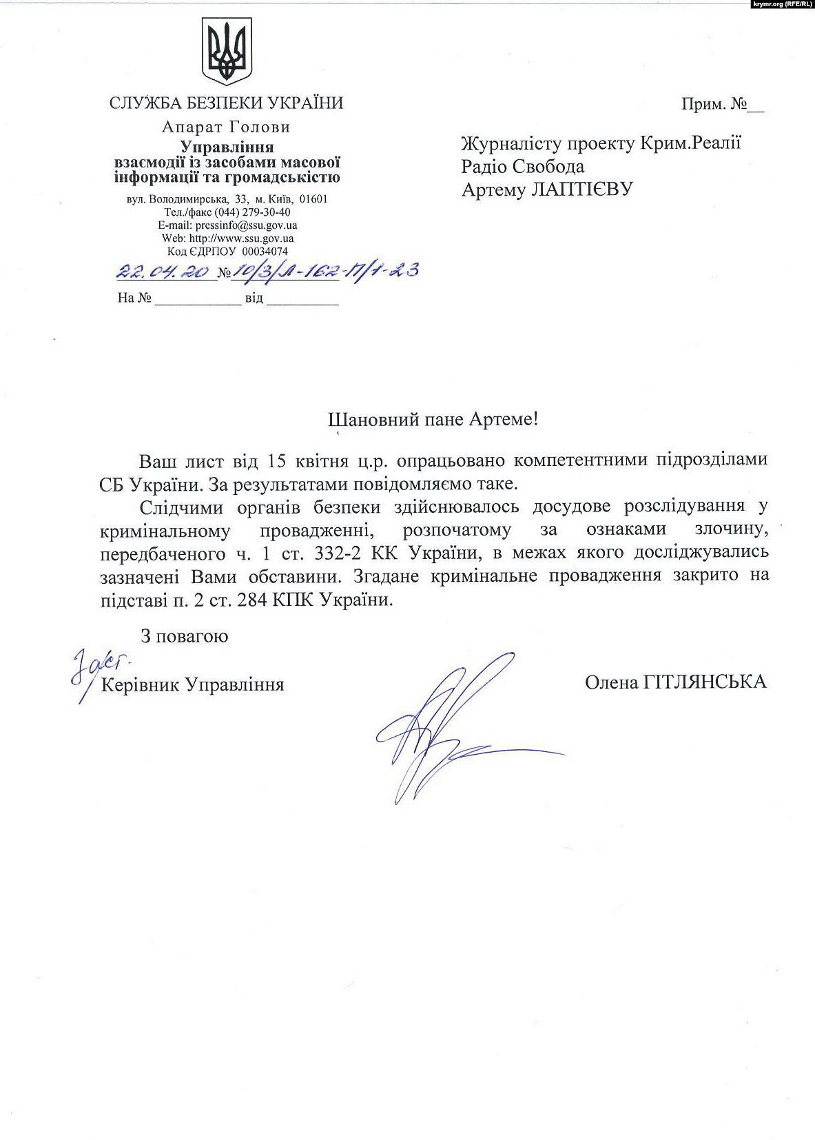 Дослівно з документу: "Слідчими органів безпеки здійснювалося досудове розслідування у кримінальному провадженні, розпочатому за ознаками злочину, передбаченого частиною 1 статті 332-2 КК України, в рамках якого досліджувалися зазначені Вами обставини (відвідування анексованого Криму – ред.). Згадане кримінальне провадження закрито на підставі пункту 2 статті 284 КПК України (встановлено відсутність в діянні складу кримінального злочину, – ред.)".