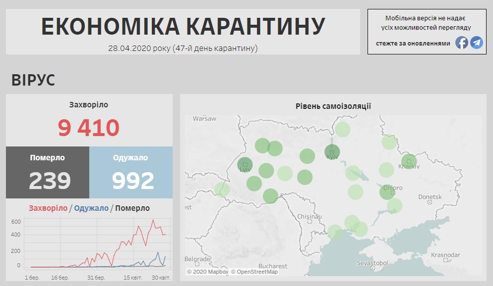Пряма мова: "Ми створили дашборд, присвячений карантину та економіці України. Це, мабуть, найбільш масштабний та докладний дашборд на цю тему. На ньому можна відстежувати вплив карантину на економіку – загалом понад 30 показників, які оновлюються щоденно/щотижня/щомісячно.