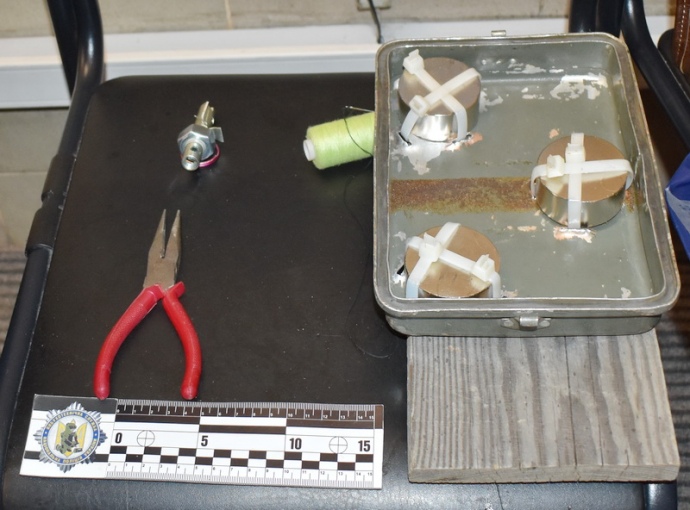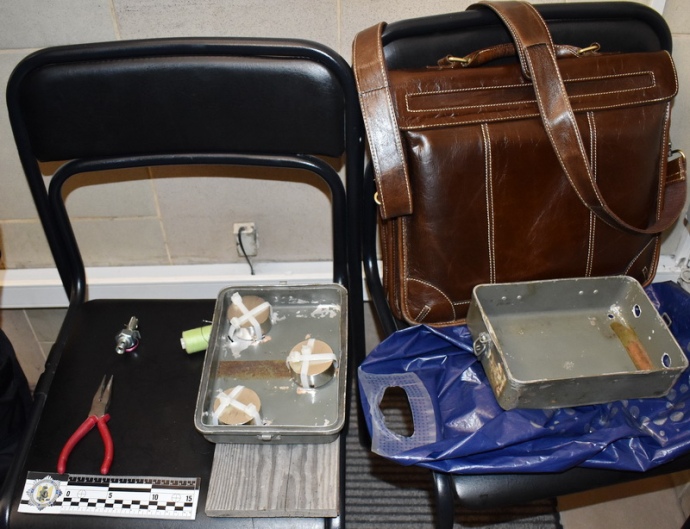 У судовій владі пишуть, що скриньки був прикріплений запал ручної гранати УЗРГМ. За словами адвоката, він приніс ударний механізм з запобіжною чекою від учбового УЗРГМ (без самого запалу, який становить небезпеку).