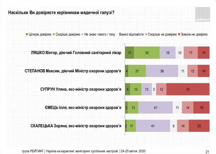 Якщо говорити про колишніх голів Міністерства охорони здоров’я, то станом на сьогодні Уляні Супрун довіряють 19%, не довіряють – 63% (не знають – 13%); Іллі Ємцю довіряють 16%, не довіряють – 33% (не знають – 41%); Зоряні Скалецькій довіряють 13%, не довіряють – 39% (не знають такої – 41%).