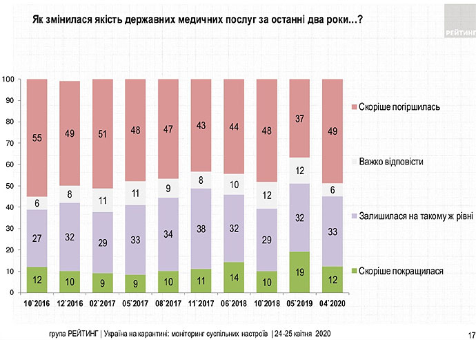 Дослівно: "У динаміці за останній рік зросла кількість тих, хто фіксує погіршення в сфері медичних послуг (з 37% до 49%). Частіше про погіршення зазначали мешканці Півдня і Сходу, старші і бідніші опитані, а також жінки".