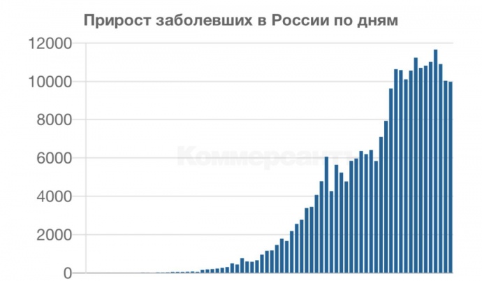Росія, за даними Університету Джонса Хопкінса, знаходиться на другому місці в світі за кількістю зареєстрованих хворих після США (1,39 млн). Далі йдуть Велика Британія (230,2 тис.), Іспанія (228,6 тис.) та Італія (222,1 тис.).