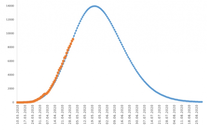 Дослівно: "За результатами прогнозного моделювання команди проєкту "ФОРСАЙТ COVID-19" такий характер розвитку процесу може продовжитися до третьої декади травня 2020 року, протягом якої ймовірно настане пік пандемії. Після цього пандемія, ймовірно, може піти на спад (кількість щоденно видужалих людей буде стійко більшою кількості щоденно інфікованих).