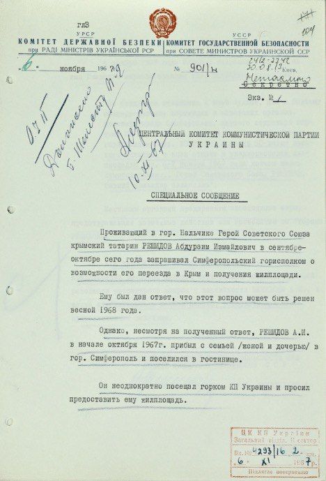 Так, у 1967 році, у 50-ту річницю Жовтневої революції, голова КДБ при Раді міністрів УРСР Нікітченко доповідав керівництву Компартії України, що кримський татарин Абдураїм Решідов планує самоспалення. Його довели до відчаю постійні відмови радянської влади, які забороняли повернення до Криму.