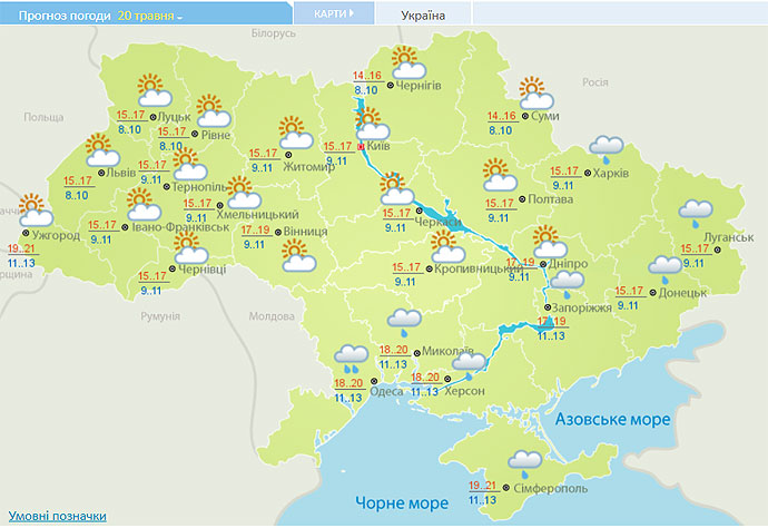 Деталі: Вночі 20 травня +8+12 градусів, на Півдні +10+15 градусів, вдень в Україні +14+19 градусів, у південній частині та на Закарпатті +17+24 градуси.