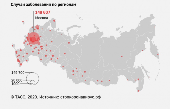 Деталі: наразі в РФ діагностовано 299 941 випадків хвороби, з них 149 607 в Москві. По всій країні 76 130 людей вже одужали, 2837 померли.