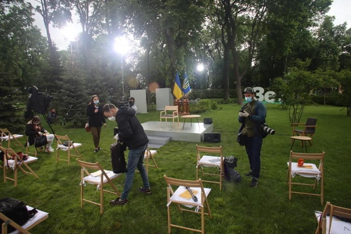 У Маріїнському парку готуються до пресконференції президента Володимира Зеленського – там установили паркани і рамки металошукачів, чергує поліція, а журналістам на вході міряють температуру і роздають маски з рукавичками.