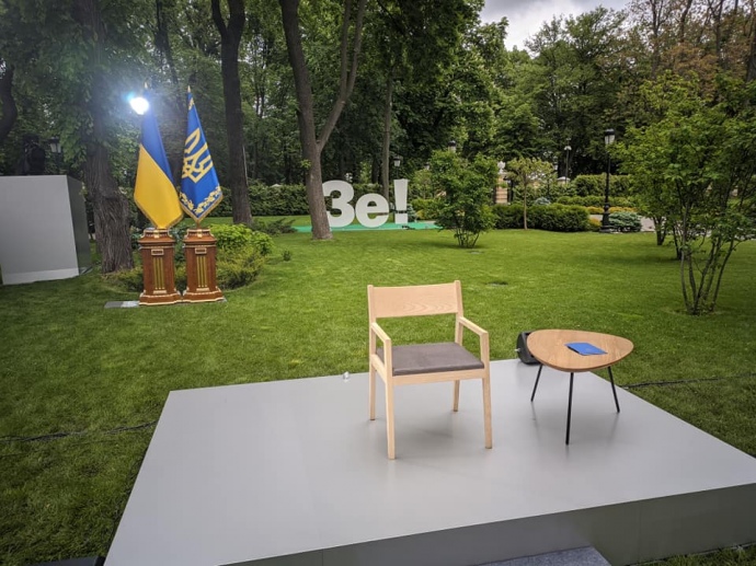 Деталі: На галявині перед Маріїнським палацом встановили сцену і стільці для журналістів, там також змонтували великі білі літери "Зе" зі знаком оклику.