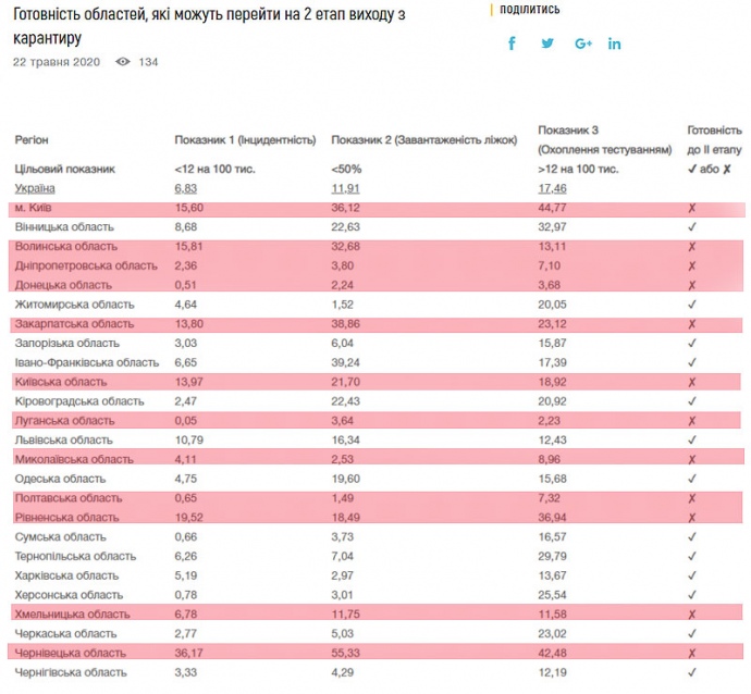 Станом на 22 травня 11 областей України не готові перейти до 2 етапу зняття карантинних обмежень, введених у зв’язку з коронавірусом.