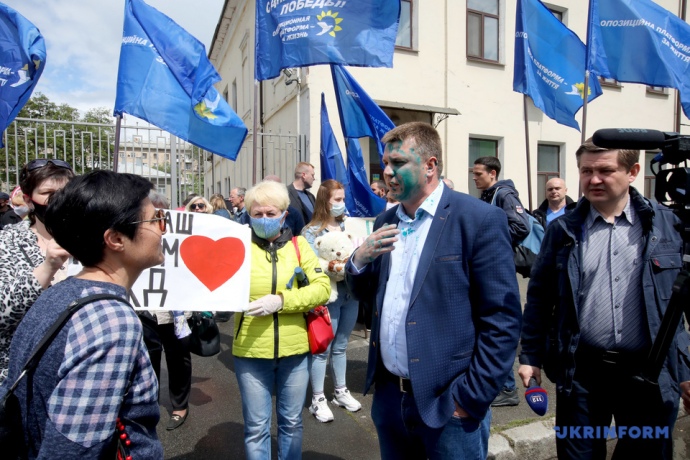 У Харкові, під час акції протесту медиків проти закриття акушерського відділення клінічної лікарні залізничників, облили зеленкою голову міської організації "Опозиційна платформа - За життя" Андрія Лесика.