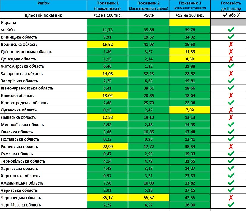 Станом на 23 травня Львівська та Дніпропетровська області не відповідають критеріям для переходу на 2 етап послаблення карантинних обмежень.