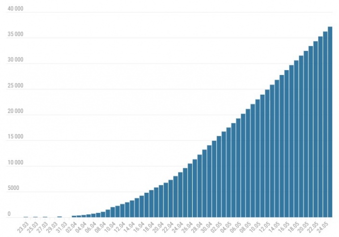 Дослівно: "У Білорусі за даними на 25 травня - 37 144 випадки COVID-19. Плюс 946 за останню добу".