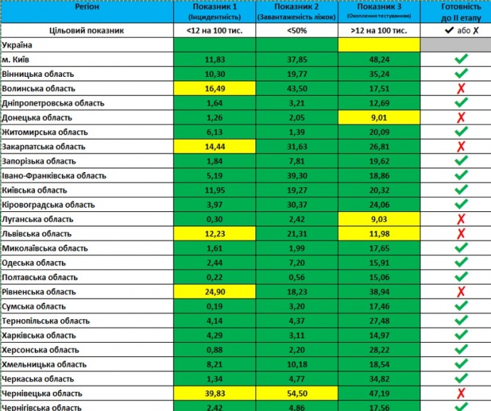Перехід областей до другого етапу карантину, що передбачає послаблення карантинних обмежень, можливий за умови відповідності епідситуації в області визначеним критеріям. Зокрема, мова йде про певну кількість хворих на 100 тисяч населення, про завантаженість ліжко-місць у лікарнях та рівень охоплення тестуванням.