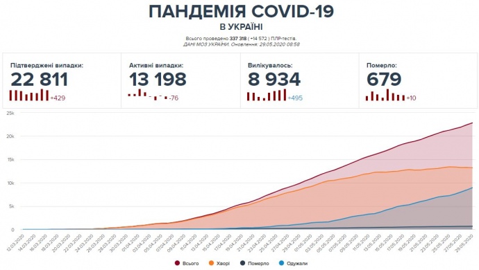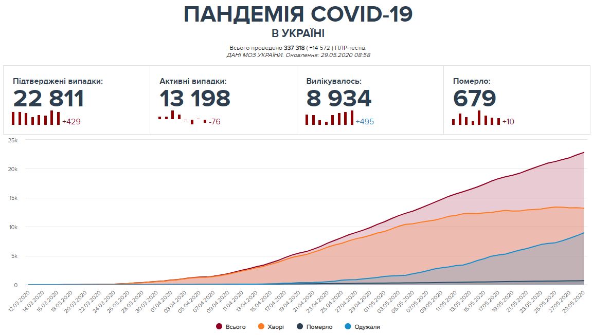 429 нових випадків захворювання на COVID-19 виявили в Україні за добу 28 травня, одужали 495 хворих, 10 пацієнтів померли, крім того, чекають на діагноз 1 011 особа з підозрою на коронавірус.