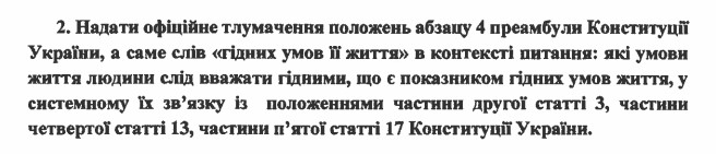 Деталі: У самому поданні 142 нардепи просять офіційно розтлумачити положення абзацу 4 преамбули Конституції, а саме слова "гідних умов її життя".