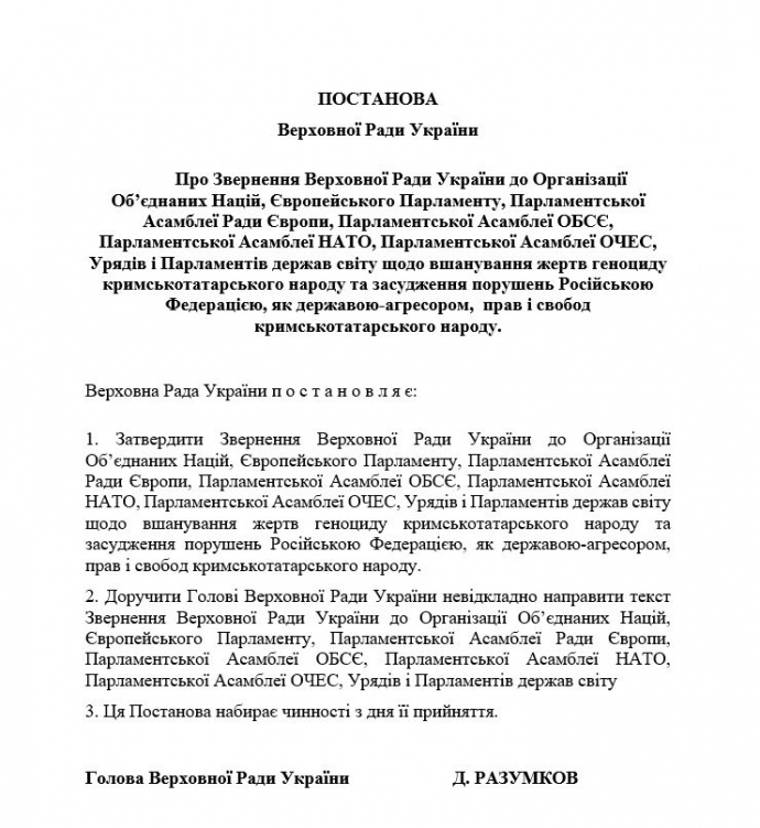 Дослівно назва постанови: "Про звернення Верховної Ради України до Організації Об’єднаних Націй, Європейського парламенту, парламентської асамблеї Ради Європи, парламентської асамблеї ОБСЄ, парламентської асамблеї НАТО, парламентської асамблеї ОЧЕС, урядів і парламентів держав світу щодо вшанування жертв геноциду кримськотатарського народу та засудження порушень Російською Федерацією, як державою-агресором, прав і свобод кримськотатарського народу".