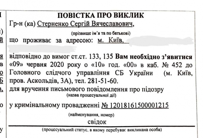 Деталі: Активіст опублікував повістку, згідно з якою його викликають як свідка 9 червня о 10 годині ранку до Головного слідчого управління СБУ для вручення письмового повідомлення про підозру.