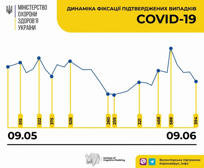 За добу 8 червня, у вихідний, коронавірусну хворобу COVID-19 в Україні підтвердили у 394 осіб, одужали 217 осіб, 13 хворих померли.