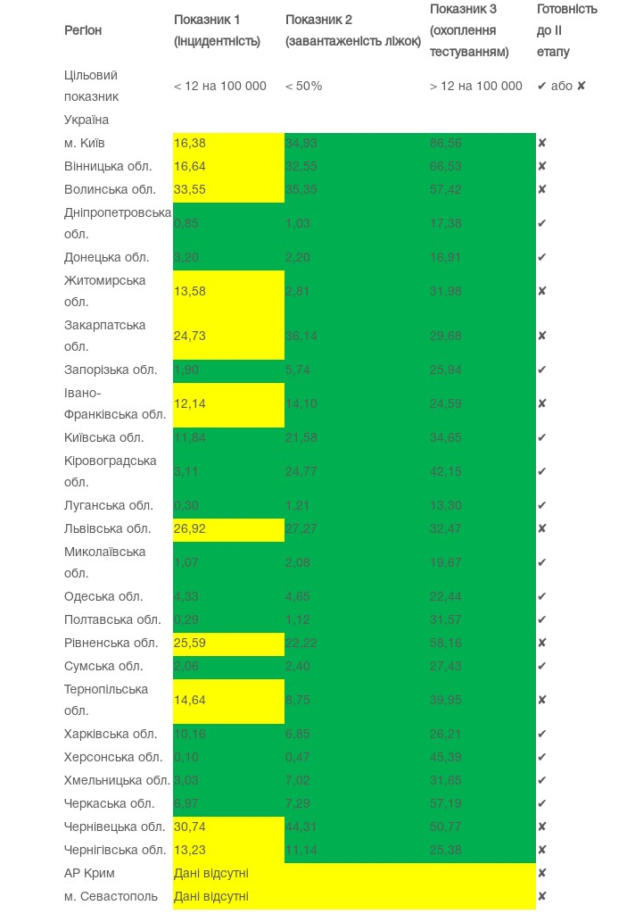 Деталі: За даними МОЗ, перейти на наступний етап послаблення обмежень не готові Київ та Вінницька, Волинська, Житомирська, Закарпатська, Івано-Франківська, Львівська, Рівненська, Тернопільська, Чернівецька і Чернігівська області.