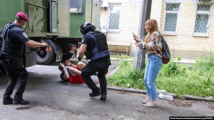 Згодом у поліції повідомили, що затримали 5 осіб біля Шевченківського райсуду через те, що один із чоловіків спровокував конфлікт із журналістами, а інші перешкоджали поліцейським під час затримання правопорушника і нецензурно висловлювалися.